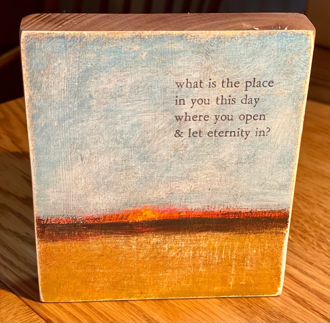 Standing in a prominent spot on my desk is a small woodblock painting from story artist Brian Andreas. These days, its question is ever-present with me: